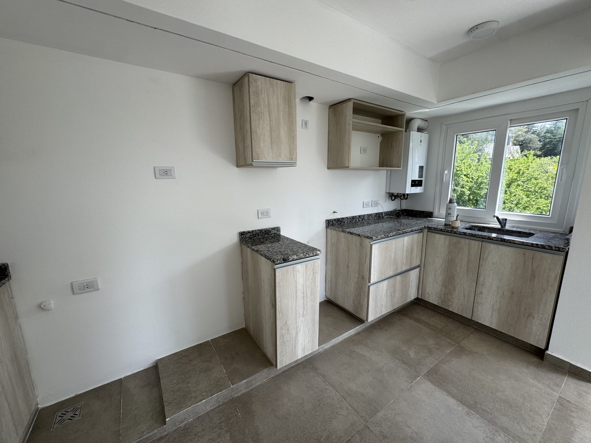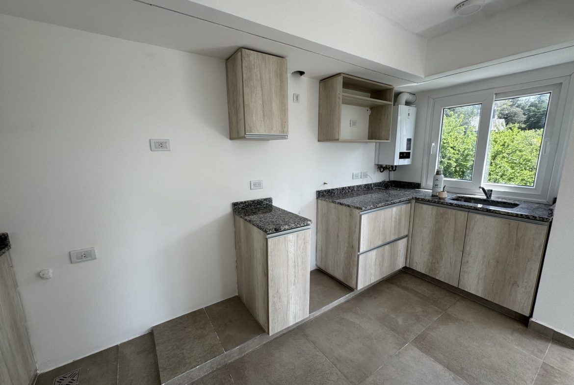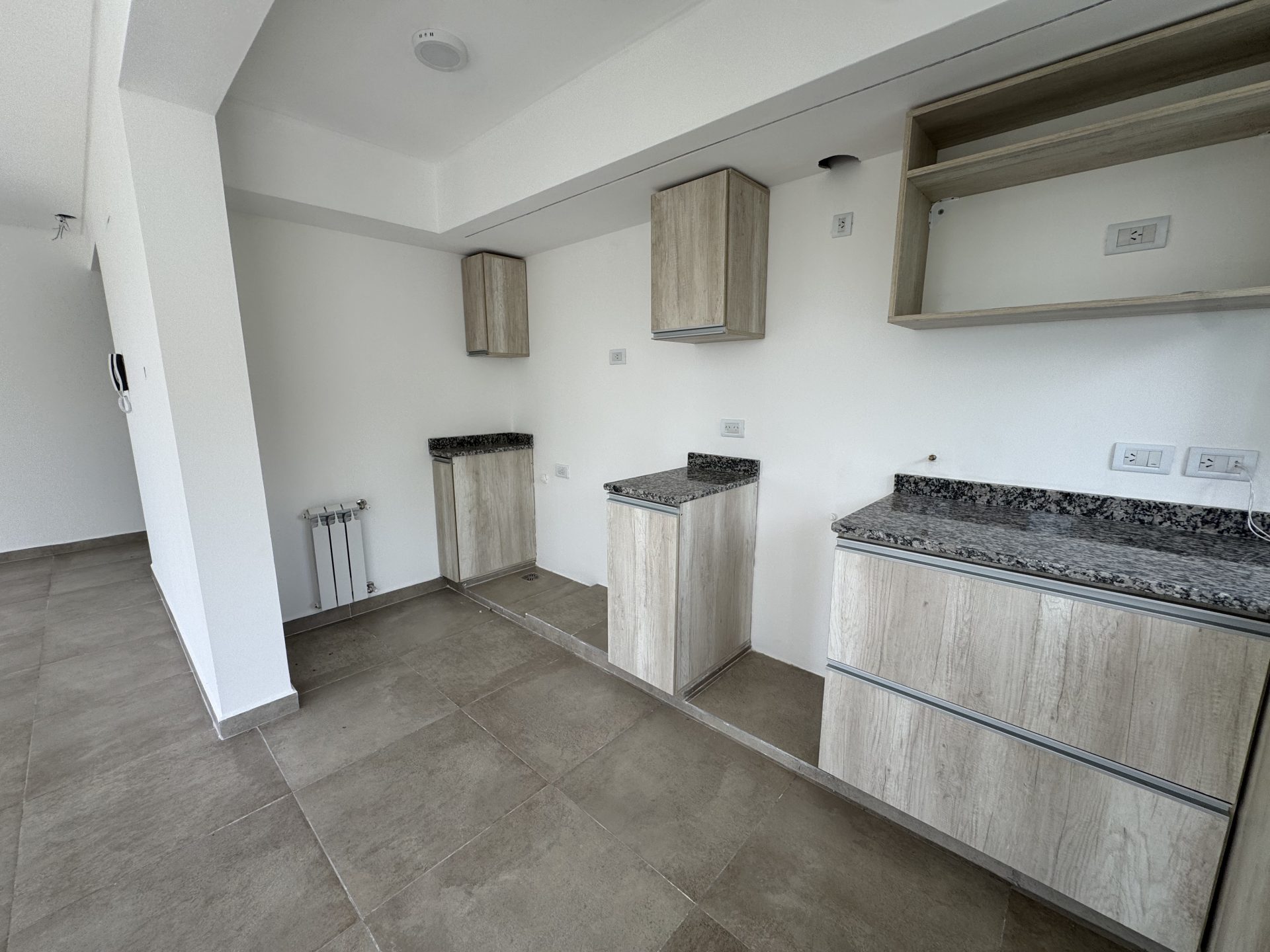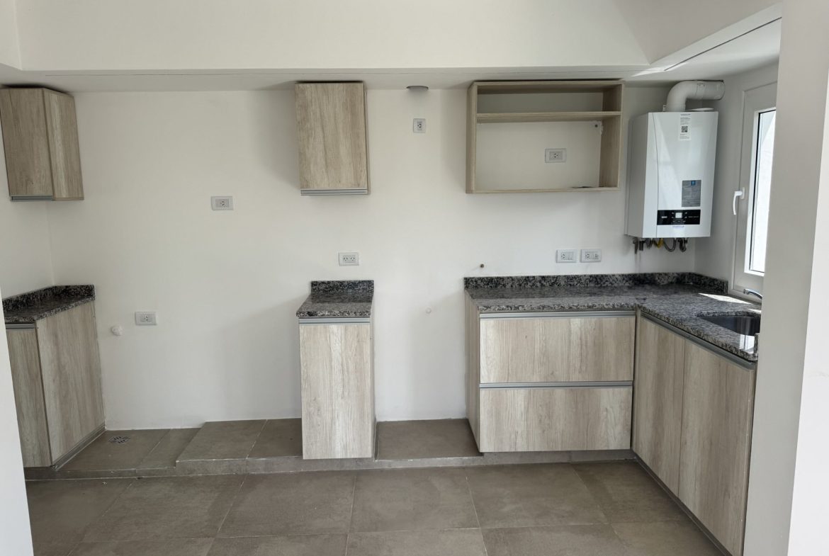 Cocina integrada al estar comedor, equipada con alacenas, bajomesada e instalación para lavarropas.