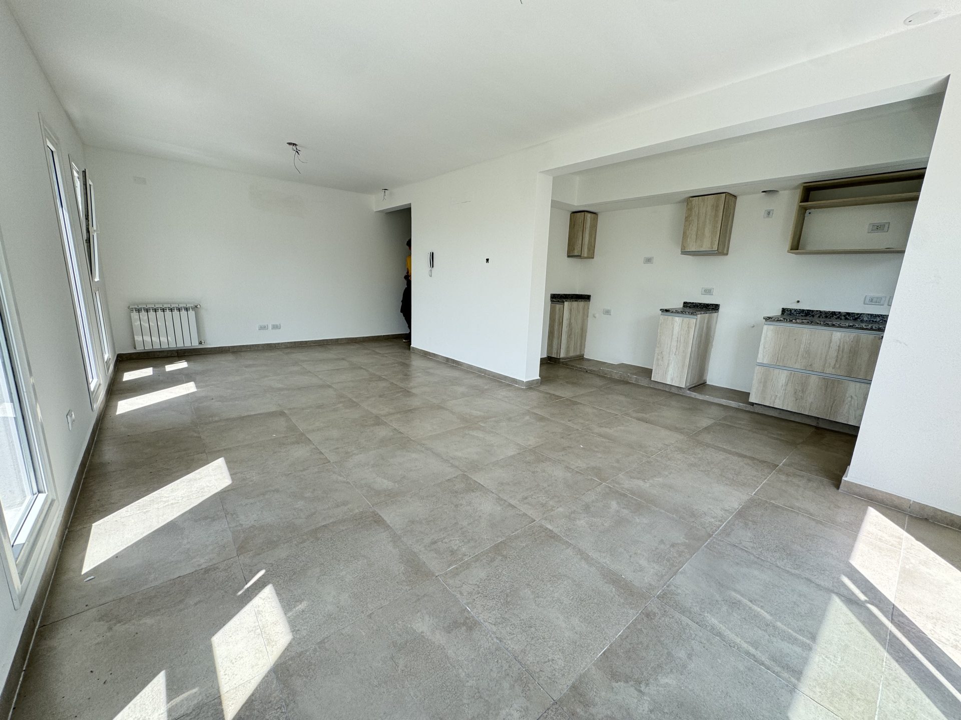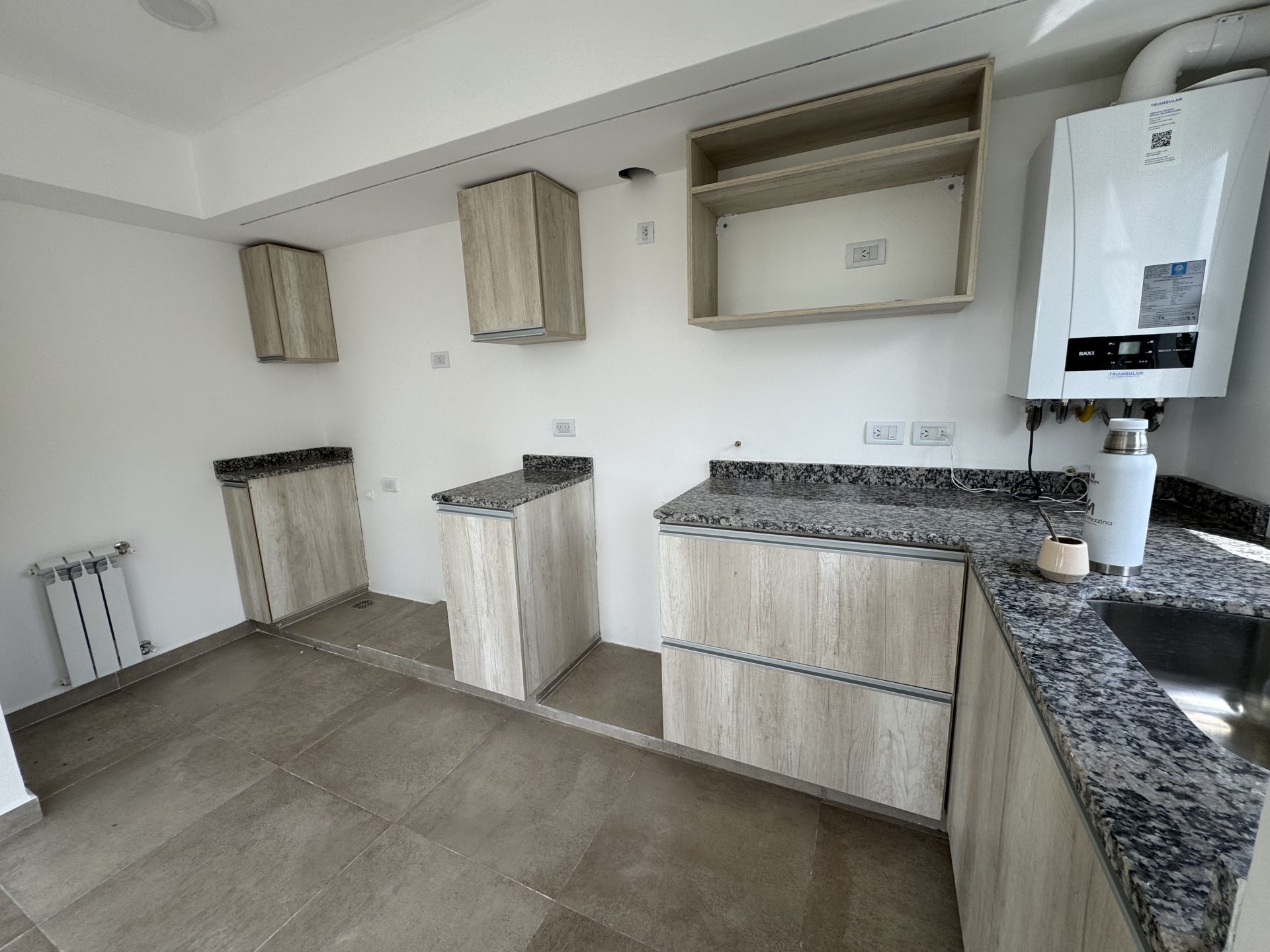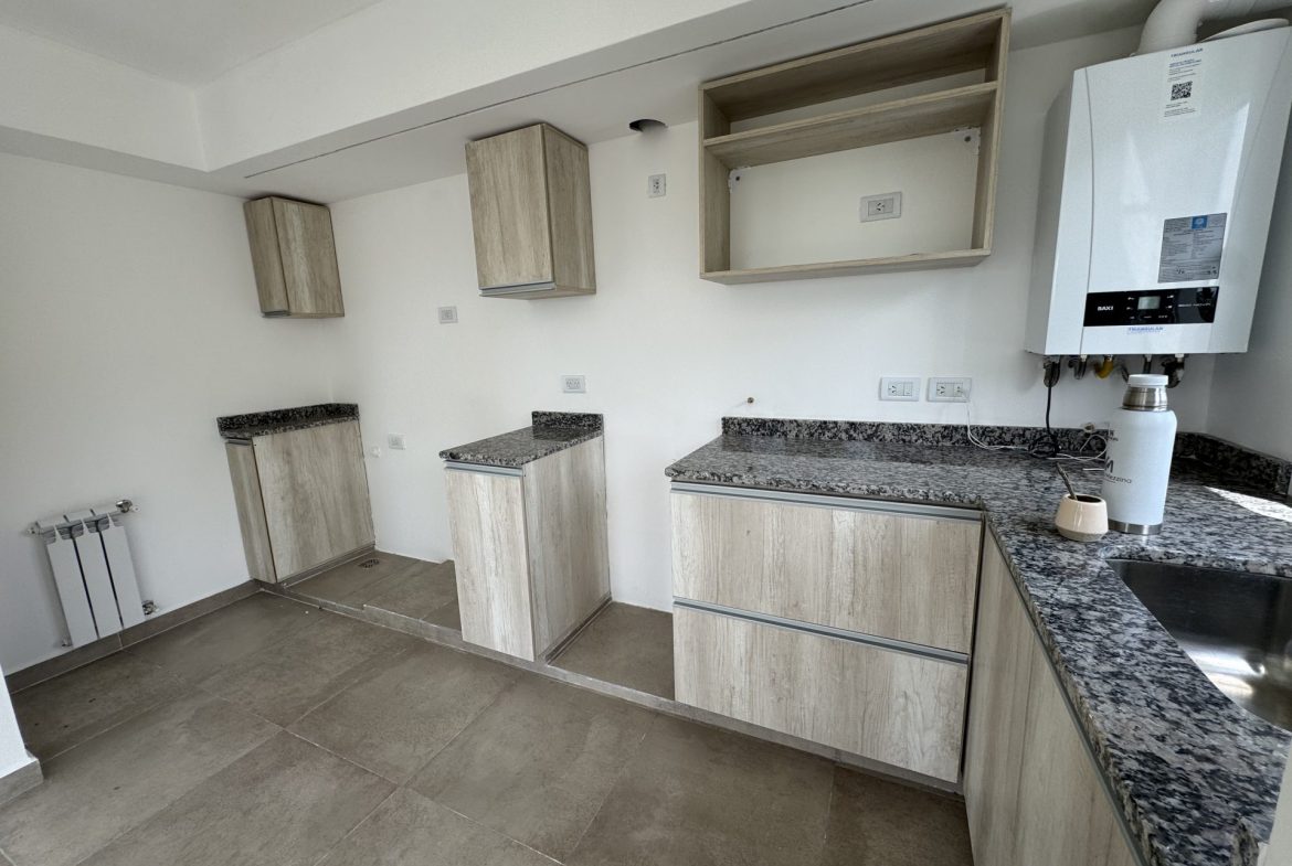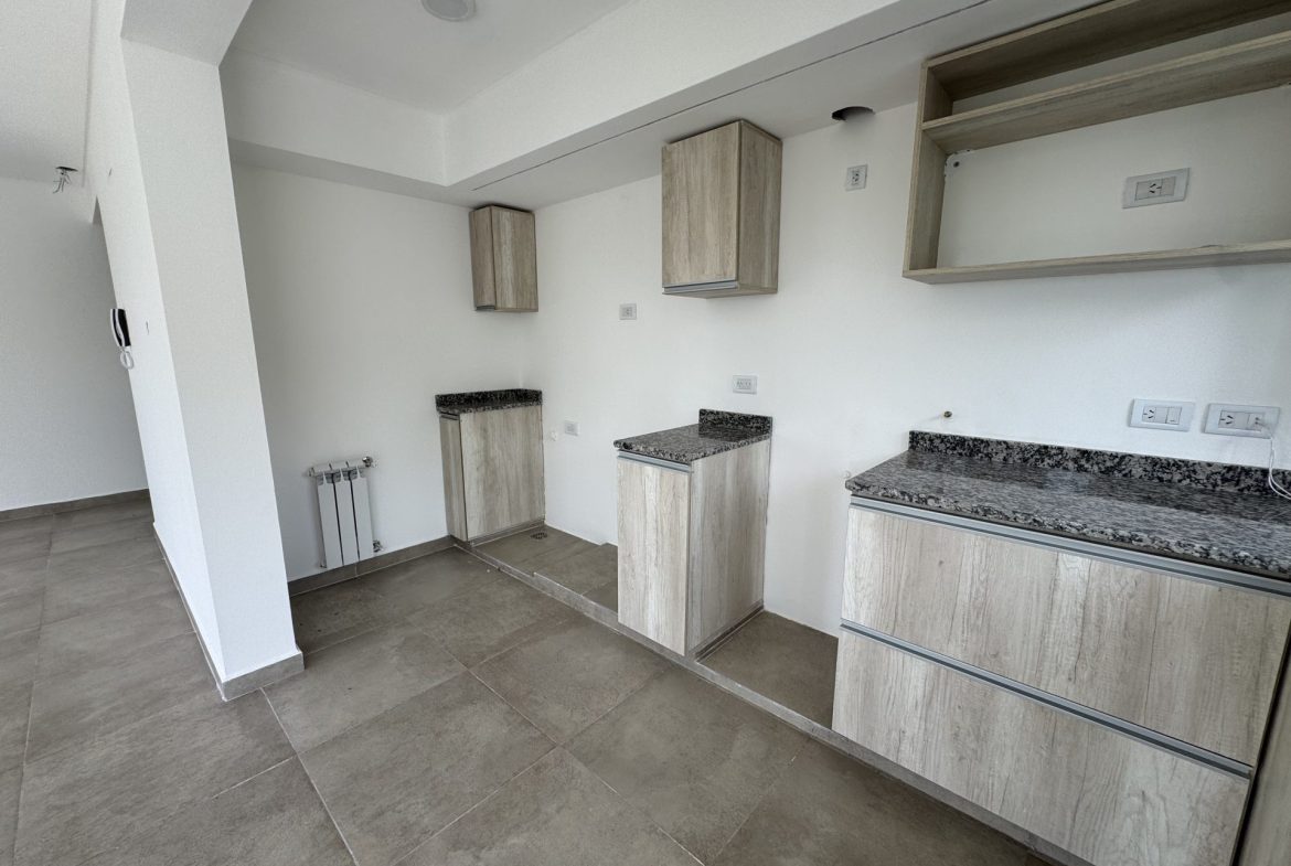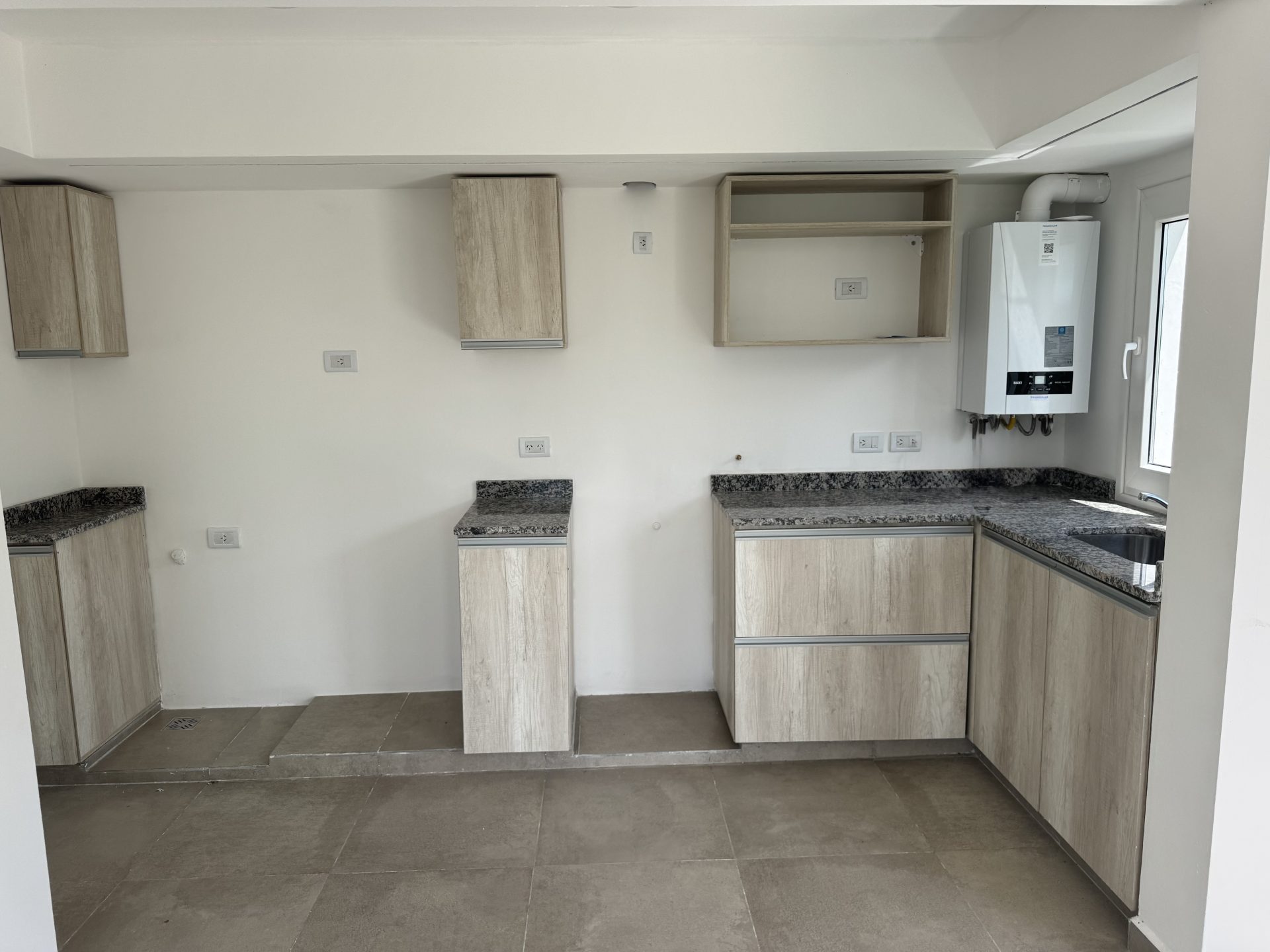 Cocina integrada al estar comedor, equipada con alacenas, bajomesada e instalación para lavarropas.