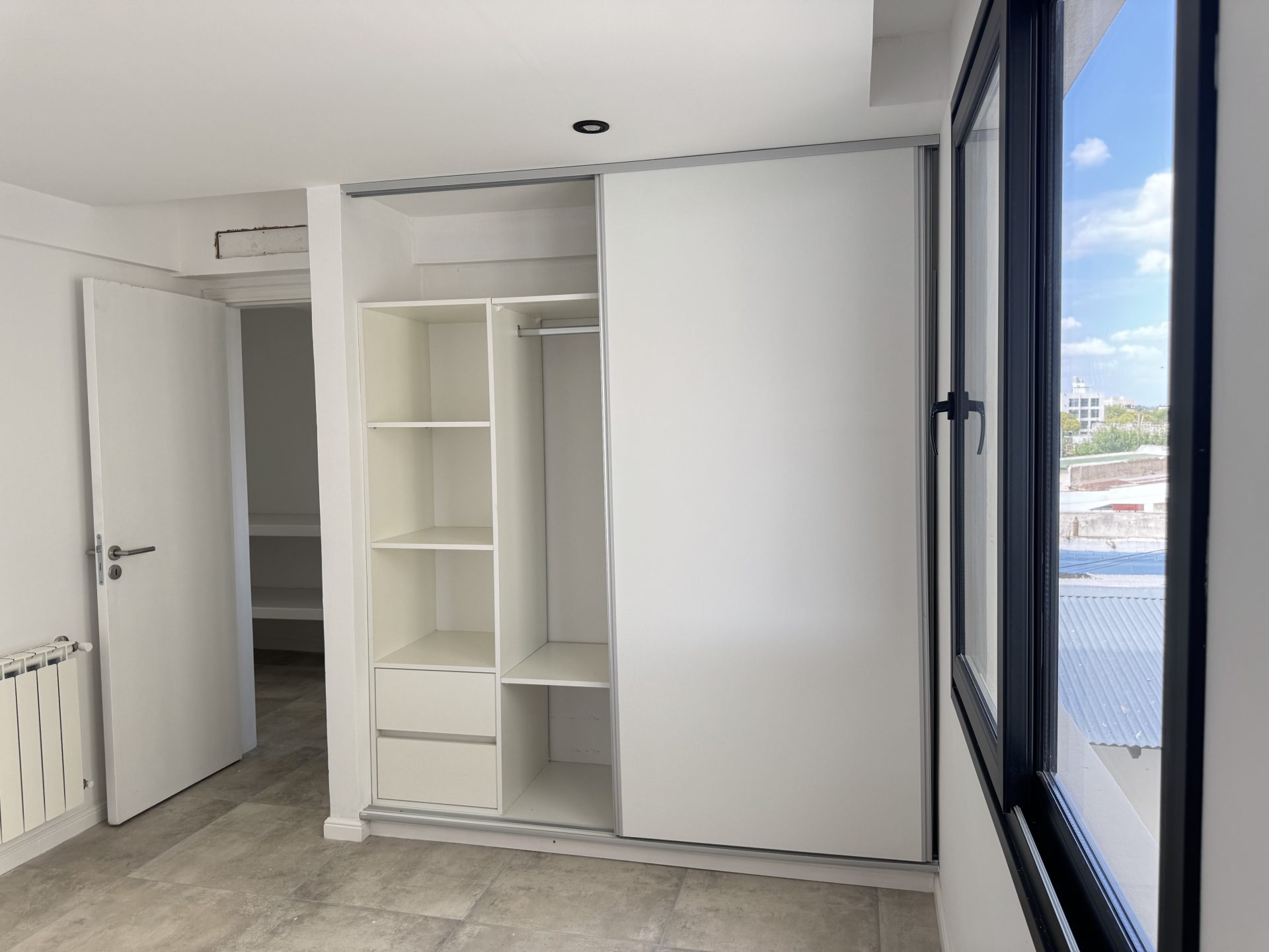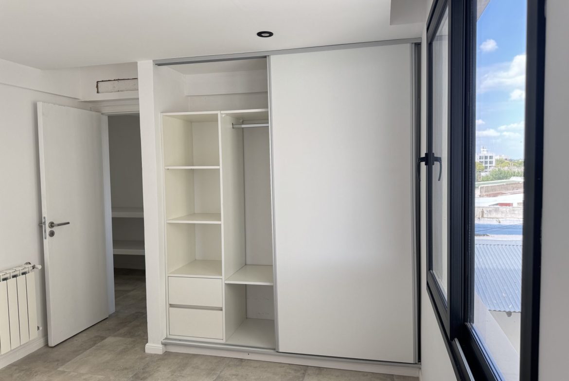 El dormitorio, de medidas estándar, cuenta con placard completo con puertas corredizas.